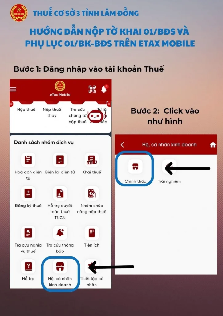 - Bước 2: Tại màn hình trang chủ, chọn mục Hộ, cá nhân kinh doanh -> Chọn Chính thức.