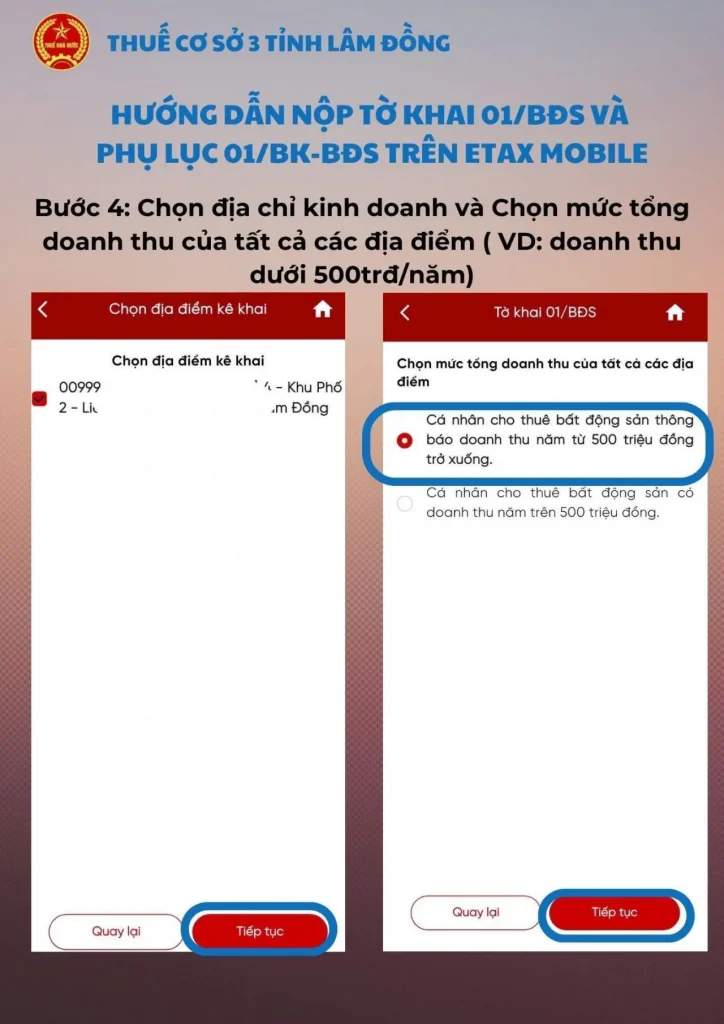 - Bước 4: Xác nhận địa điểm kinh doanh Hệ thống sẽ hiển thị danh sách tất cả các địa điểm kinh doanh mà bạn đã đăng ký. Bạn hãy tích chọn ít nhất 1 địa điểm để kê khai (có thể tích nhiều địa điểm cùng lúc nếu cho thuê nhiều nơi), sau đó tích chọn cơ quan thuế tương ứng với địa chỉ đã chọn. Lưu ý quan trọng: Bạn cần tự tính toán xem tổng doanh thu trong năm của tất cả các địa điểm đã chọn có lớn hơn 500 triệu hay không để chuẩn bị thao tác cho đúng ở các bước sau. Kiểm tra lại thông tin, nếu đúng nhấn Tiếp tục.