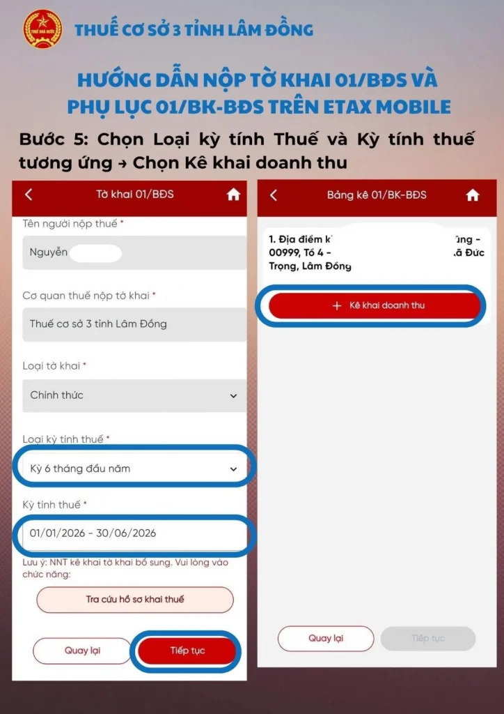 - Bước 5: Chọn Loại kỳ tính thuế (Năm hoặc kỳ 6 tháng) -> Điền Kỳ tính thuế tương ứng -> Nhấn Tiếp tục.