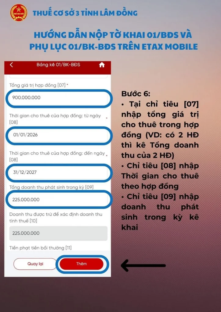 - Chỉ tiêu [04], [05], [06]: Hệ thống sẽ tự động trích xuất các địa chỉ mà bạn đã chọn tại Bước 4.Chỉ tiêu [07]: Điền tổng doanh thu trên tất cả các hợp đồng cho thuê.Chỉ tiêu [08]: Điền khoảng thời gian cho thuê thực tế của các bất động sản.Chỉ tiêu [09]: Điền mức doanh thu phát sinh trong kỳ kê khai hiện tại.